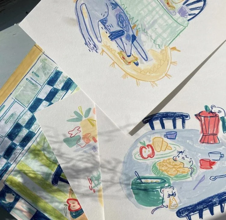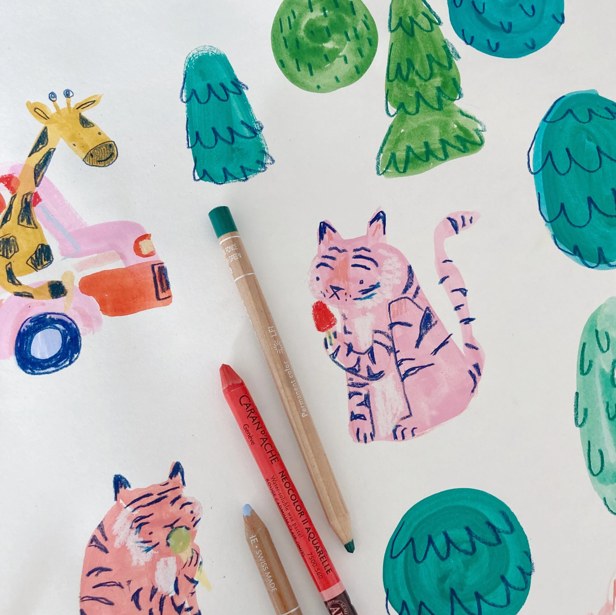 Hand and digital drawing methods are intertwined within my practice as I combine a myriad of drawing mediums to create stories that evoke feelings of playfulness and whimsicality.